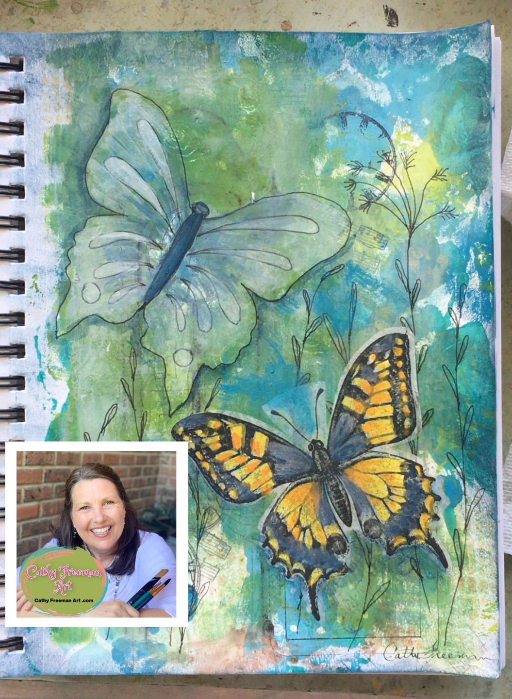 🐝 During our Q&A time this June, I decided to pull out a few supplies and show the Art Sisters how-to take a page in their art journal, that they might not be satisfied with, and use it as the background for another project.